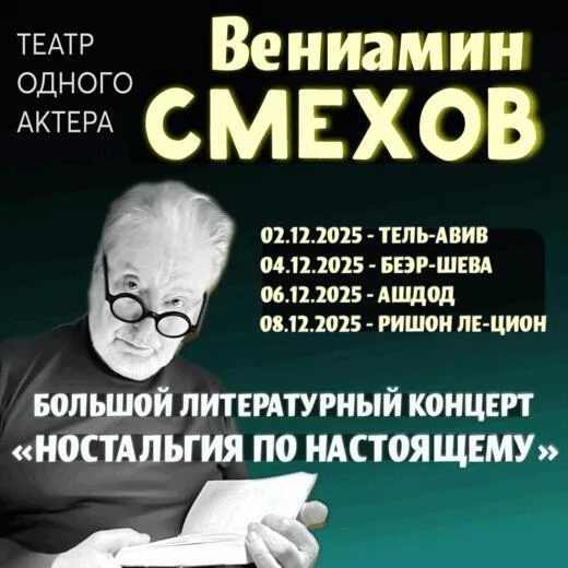 Этой зимой Смехов возвращается в Израиль, чтобы поделиться своими мыслями о вечных ценностях. Это уникальная возможность встретиться с актёром, который не требует введения, чей голос узнаваем с первых же слов.
